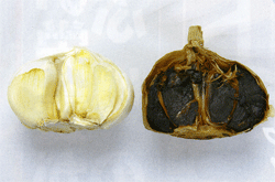 通常のニンニク(左)と熟成発酵黒ニンニク(右)